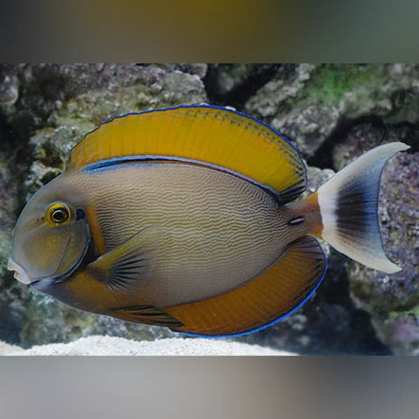 The Bariene Tang (Acanthurus bariene), also known as the Black-spot Surgeonfish, is a beautiful and very beneficial addition to a marine aquarium. This tang is easily identified by its unique coloration: a beautiful dark brown or black body with a striking yellow or orange line along the dorsal and anal fins, and a prominent black spot at the base of the pectoral fin. It is an active and graceful swimmer that requires plenty of open space to roam due to its large size. While it is generally peaceful with most other species, it can be territorial towards other tangs, so it's often best to introduce it to the tank last. As a herbivore, it is a fantastic algae-eater, making it a valuable and hardworking member of any clean-up crew. It is completely reef-safe and will not harm corals or invertebrates.
