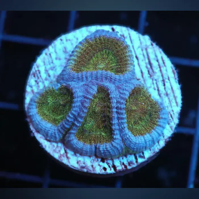 The Blue Skull Favia is a highly sought-after collector strain of Favia coral, a type of Large Polyp Stony (LPS) coral. Favia species are often referred to as "Moon Corals" or "Brain Corals" and are foundational pieces in many reef aquariums due to their durability and dense, patterned growth.