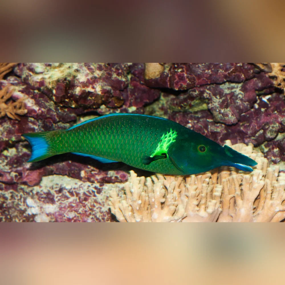 The Green Birdmouth Wrasse (Gomphosus caeruleus) is a large, vibrant, and extremely active wrasse species known for its distinctive, elongated, beak-like snout, which gives the genus the common name "Bird Wrasse." It is sometimes referred to as the Blue-Green Bird Wrasse or Indian Ocean Bird Wrasse, as it is native to the Indian Ocean.