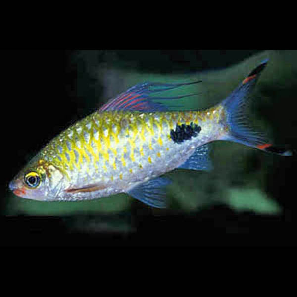 The male filamentosa barb gets a lacy long colorful dorsal fin - hence filamentosa, and color highlites on the body that look like makeup - hence sometimes called the mascara barb. These barbs are rare and wild from India and seldom seen in the trade - one reason they are a bit pricey. The good news is that these fish are hardy and adapt well to aquariums.