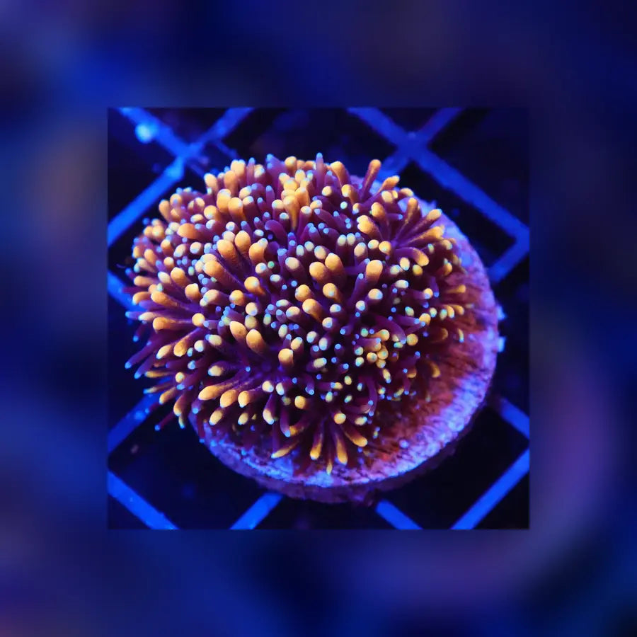 This specific strain is celebrated for its incredible, multi-layered coloration, which typically includes an icy blue or deep purple base skeleton contrasted by neon green or chartreuse tentacles and, most notably, bright yellow, orange, or reddish tips on the septa and tentacles. The unique combination makes it a spectacular showpiece.