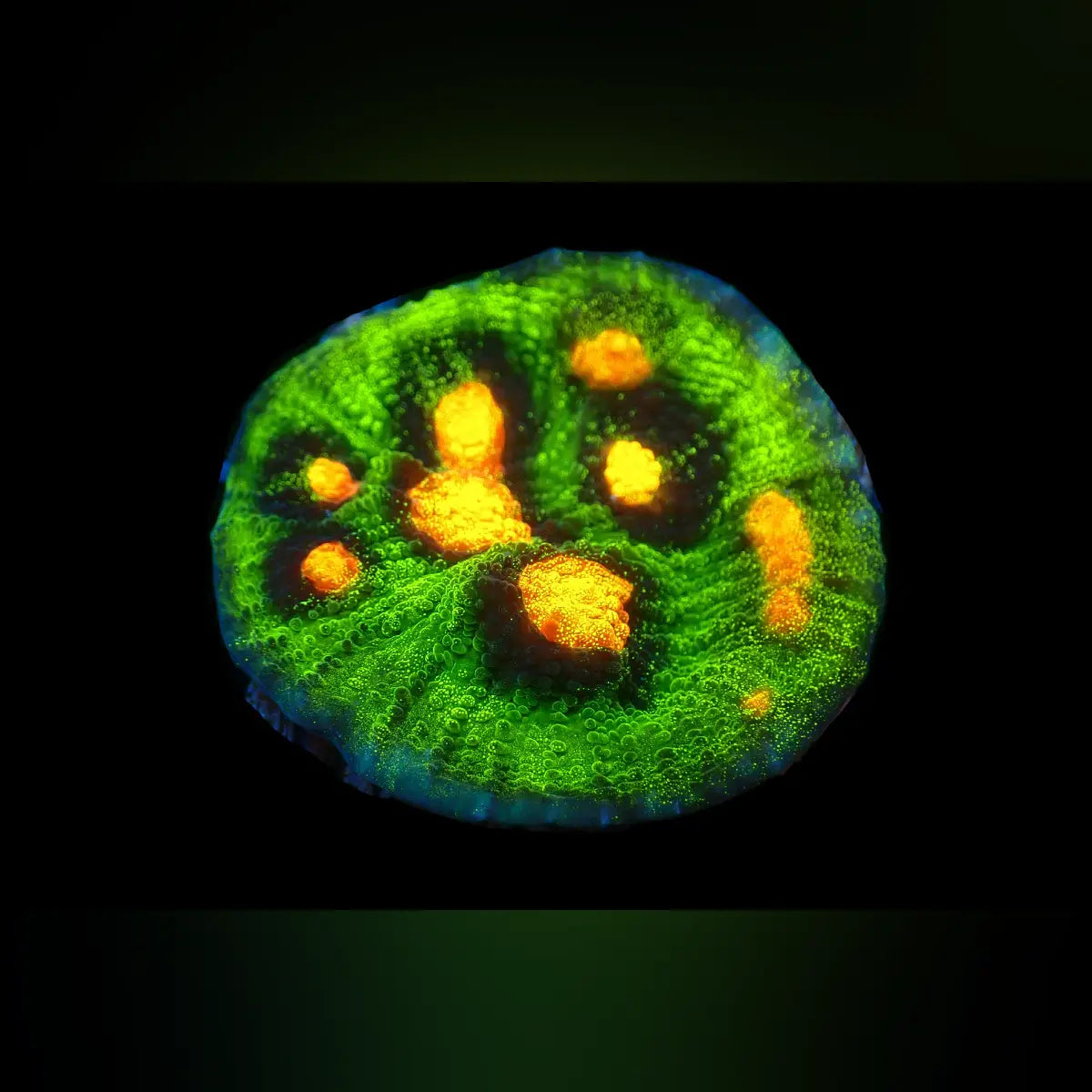 The name "Raja Rampage" highlights the powerful, almost aggressive use of color, reminiscent of the vibrant chalices found in the Raja Ampat region. This coral grows in an encrusting and then thick, plating or cup-shaped morphology. The red and orange pigmentation is best maintained under moderate light intensity combined with precise water chemistry, making it a spectacular focal point for the lower sections of a reef tank.